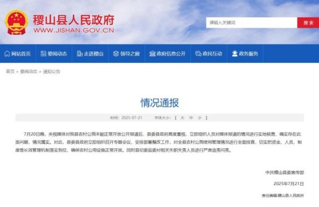 中央广播电视总台《财经调查》栏目7月20日晚曝光了“稷山县农村出现高标准公厕‘只能看不能用’”现象,山西稷山县委宣传部今天(7月21日)就此事发布情况通报: