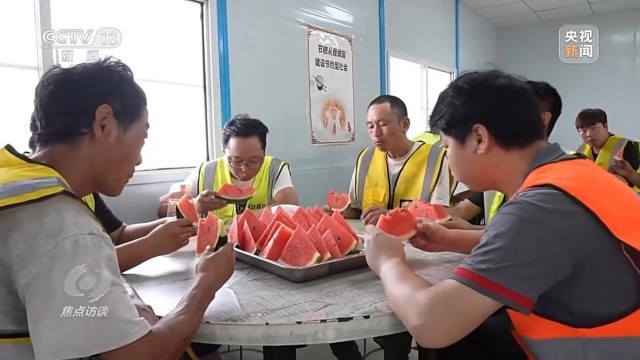 作为当地的重点民生项目,既要保进度,又要保障施工人员的安全和健康。为此,项目施工方采用“抓两头、歇中间”的错峰施工模式——每天利用好清晨和傍晚温度较低时进行施工,避开上午10点半到下午3点的高温时段。另外,施工现场提供绿豆汤、矿泉水、藿香正气水等防暑降温物资,为一线工人做好后勤保障工作。