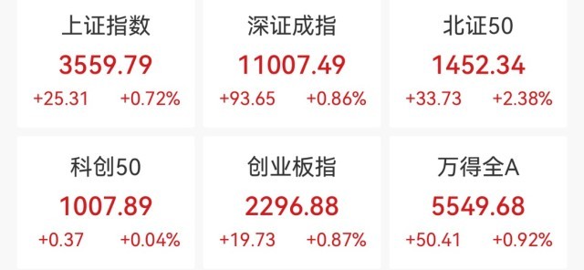 中新经纬7月21日电 21日,A股三大指数高开高走,沪指、创业板指创年内新高。截至收盘,上证指数涨0.72%,报3559.79点;深证成指涨0.86%,报11007.49点;创业板指涨0.87%,报2296.88点。
