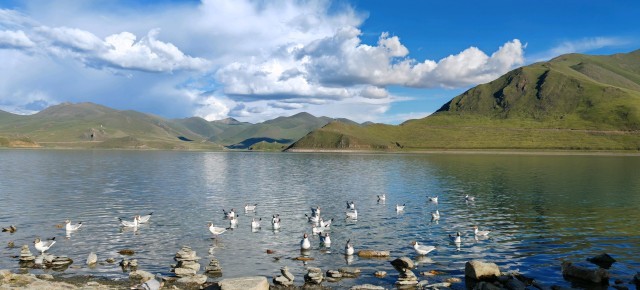 羊卓雍措湖面上成群的鸟儿。中青报·中青网记者王俊秀摄