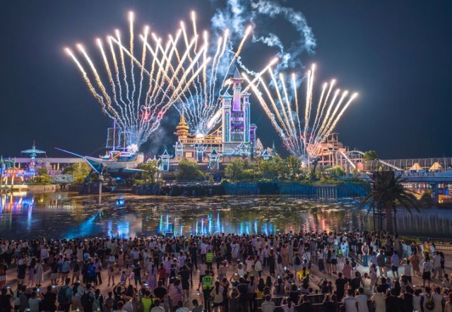 2025年7月19日,在湖北省襄阳市华侨城奇幻谷,游客观看大型夜间演艺秀《奇幻城堡光影秀》(无人机照片)。新华社发(杨东摄)