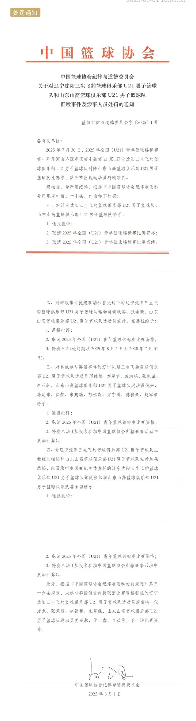 7月30日,在2025年全国(U21)青年篮球锦标赛第一阶段河南赛区比赛中,辽宁男篮和山东男篮发生群殴事件,两支球队几乎所有球员,包括教练员卷入其中。经过中国篮协调查,辽宁男篮黄秋实、张峻豪,山东男篮袁帅、崔嘉航被停赛三年,由于黄秋实、张峻豪已经代表辽宁男篮出战CBA联赛,这意味着未来三个赛季,他们都将缺席联赛的比赛。
