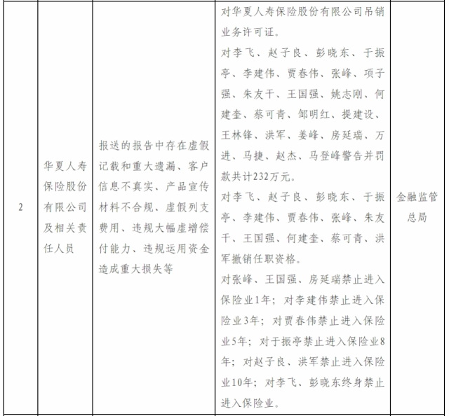 此外,金融监管总局对张峰、王国强、房延瑞禁止进入保险业1年;对李建伟禁止进入保险业3年;对贾春伟禁止进入保险业5年;对于振亭禁止进入保险业8年;对赵子良、洪军禁止进入保险业10年;对李飞、彭晓东终身禁止进入保险业。