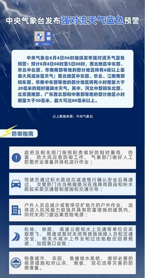 8月4日6时,中央气象台发布暴雨橙色、高温橙色、强对流蓝色三预警: