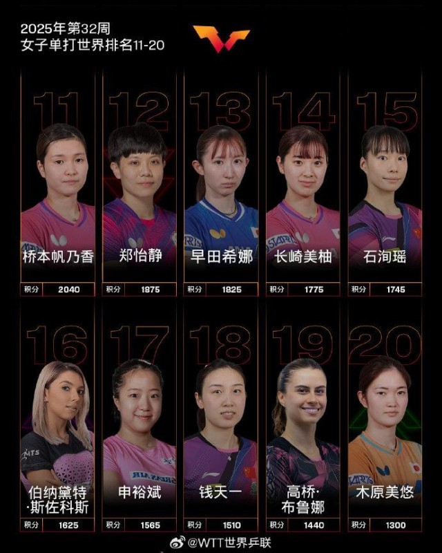 WTT球星挑战赛伊瓜苏站女单冠军张本美和排名上升1个名次位列第6;亚军长崎美柚排名上升6个名次位列第14,刷新个人职业生涯新高;四强桥本帆乃香排名上升3个名次位列第11,刷新个人职业生涯新高。