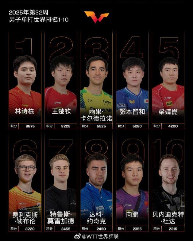 8月5日,国际乒联发布2025年第32周世界排名,孙颖莎连续第160周女单世界第一。男单方面,林诗栋继续领跑。