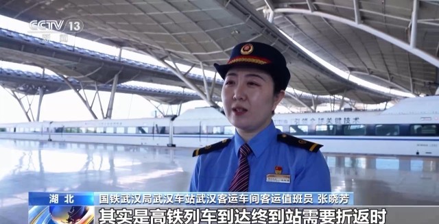 国铁武汉局武汉车站武汉客运车间客运值班员 张晓芳:列车的“变脸”,其实是高铁列车到达终到站需要折返时,通过这种灯光的变化,向我们站台的工作人员传递出本趟列车即将进行换端作业的视觉语言,也就是我们常说的高铁要“调头”了。