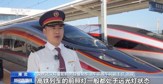 国铁武汉局襄阳机务段襄阳东动车运用车间副主任 刘瑶:高铁列车的前照灯一般都处于远光灯状态,这也是为了能让司机在最大视距范围获得线路信息。一旦发生紧急情况,就能为司机提供更多的判断和操作时间,尽可能地降低危险和损失。
