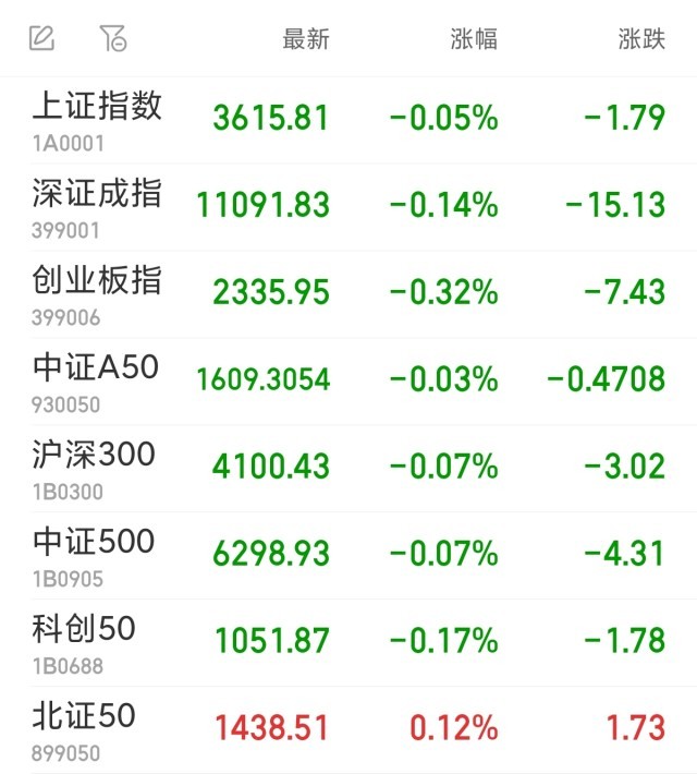 中新经纬8月6日电 周三,A股三大指数集体低开。上证指数跌0.05%,报3615.81点;深证成指跌0.14%,报11091.83点;创业板指跌0.32%,报2335.95点。