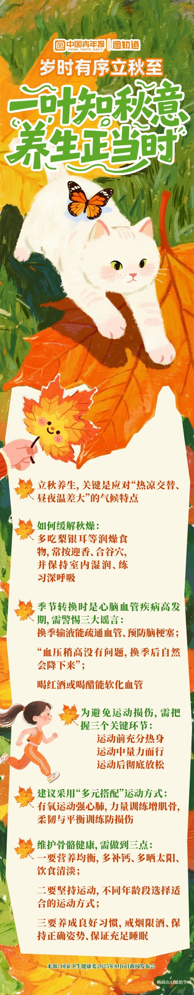 秋意渐浓,您的健康指南已送达!一图速览为您解锁:如何进行秋季养生和应对温差与秋燥?换季时节,心脑血管的三大谣言,您信了几个?如何避免运动损伤和科学运动强健骨骼?