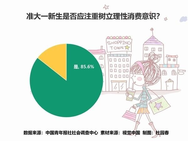 新生进入大学后,将拥有更大的消费自主权。调查中,85.6%的受访准大一新生认同应注重树立理性消费意识。