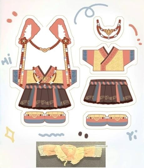 彭琬涵开始找寻这件衣服的详细资料,她先是浏览了敦煌马圈湾汉代烽燧遗址的考古简报,又询问了敦煌博物院,但信息都较少,最后还是通过行业内朋友的帮助,找到了《敦煌马圈湾汉代烽燧遗址发掘报告》,看到记载:“以素绢手工缝制,以深红色绢作领和袖,以深蓝色绢作袖缘。衣长4厘米……下摆残。”于是,她产生了一套完整娃衣的设计思路,并画了稿图——左襟压右襟的汉制交领,上襦长度控制在腰间;文物下裙虽残缺,但参考西汉平面裁剪技法,下裙延伸出垂坠裙摆,腰间褶皱与系带均按出土资料复原。颜色方面,她选用风化后的现存色,上襦为鹅黄色、橙红色和蓝绿色,下裙为深棕色。娃衣还增添了几种汉代经典纹样,并从汉代器物中提取出元素,做了一些原创设计。