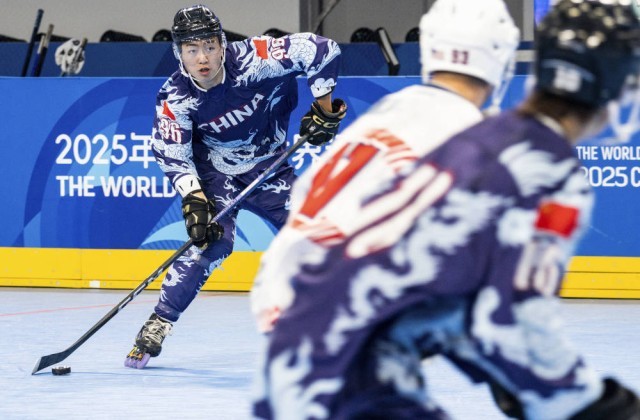 8月7日,中国队选手胡文瀚(左一)在成都世运会单排轮滑球男子A组预赛中。新华社记者 谢剑飞 摄