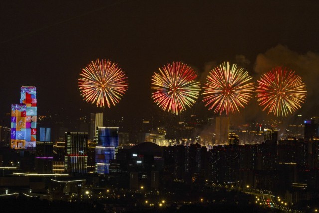 这是8月7日拍摄的开幕式上的焰火表演。新华社记者 沈伯韩 摄