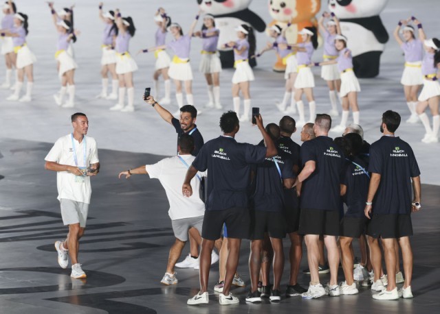 8月7日,巴西体育代表团成员在开幕式现场自拍留念。 新华社记者 姜克红 摄