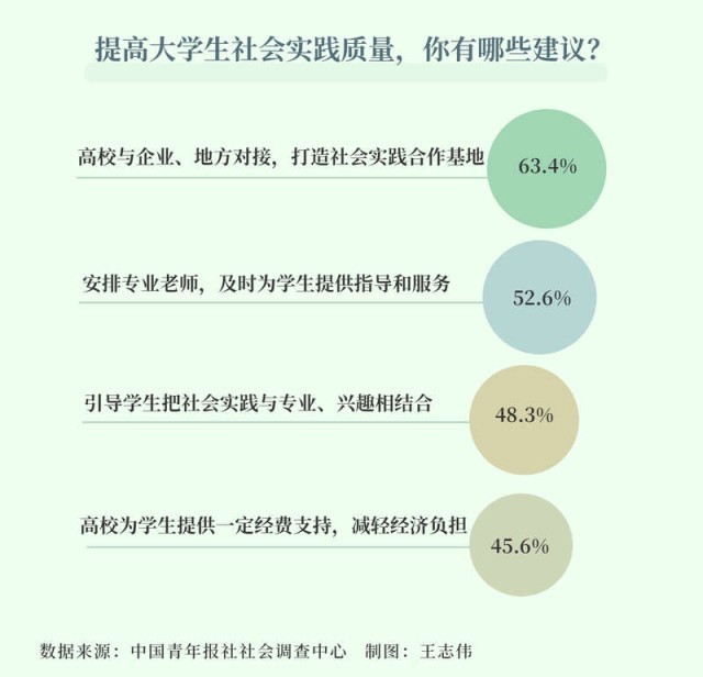 提高大学生暑期社会实践质量,63.4%的受访大学生希望高校与企业、地方对接,打造社会实践合作基地,52.6%的受访大学生希望安排专业老师,及时为学生提供指导和服务,48.3%的受访大学生建议引导学生把社会实践与专业、兴趣相结合。