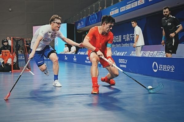 8月6日,距离第12届世界运动会开幕还有一天,软式曲棍球项目在成都新都香城体育中心率先开赛。图为中国男子软式曲棍球国家队在男子团体预赛小组赛中迎战芬兰队。视觉中国供图