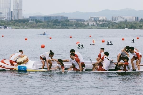 8月9日下午,成都兴隆湖湖滨赛场,成都世运会龙舟8人座公开组2000米追逐赛决赛。图为获得季军的西班牙队用自己的方式庆祝胜利。视觉中国供图