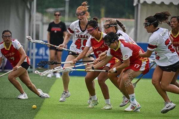 8月9日,2025年成都世运会女子棍网球A组预赛。图为中国队迎战加拿大队。视觉中国供图
