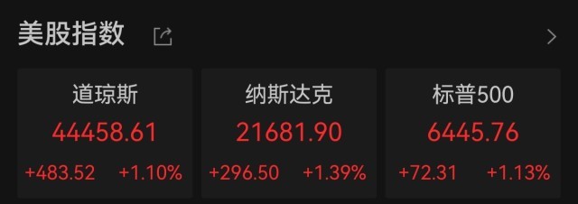 截至收盘,道琼斯工业指数涨483.52点,涨幅1.10%,报44458.61点;纳斯达克指数涨296.50点,涨幅1.39%,报21681.90点;标普500指数涨72.31点,涨幅1.13%,报6445.76点。