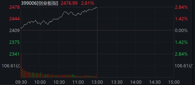 截至午间收盘,上证指数涨0.56%,报3686.34点;深证成指涨1.47%,报11518.83点;创业板指涨2.81%,报2476.99点。半日成交额较上一交易日放量。
