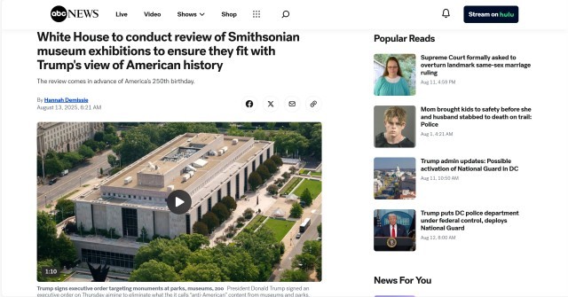 当地时间8月12日,美国《华尔街日报》报道称,负责运营美国主要博物馆的史密森尼学会最近收到了一封来自白宫的信件。特朗普的3名高级助手在信中称,白宫希望博物馆展示的内容与特朗普的指示保持一致,“彰显美国例外论,消除分裂或党派叙事,恢复对文化机构的信心”。信中列举了位于华盛顿的8家博物馆,要求它们的负责人在30天内提供正在展示的展品的详细信息。