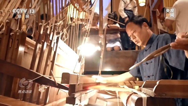 蜀锦省级非遗传承人 曹代武:梭子从这个开口里边过来,然后我就把纬线编织到里面了,织出来就是你现在看到的这个唐代的五彩鸟纹样。再来一梭,一梭一梭的,就这样反反复复。