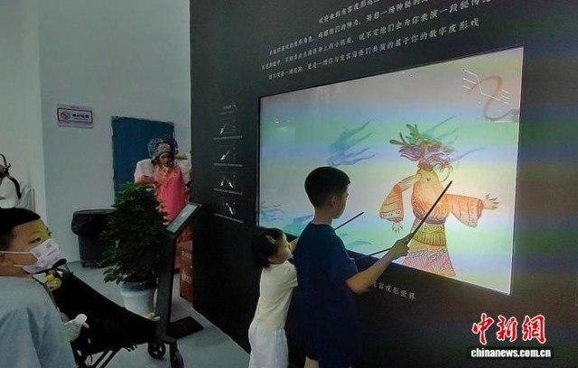 8月15日,2025“新疆是个好地方”非遗援疆主题展示活动在新疆和田约特干故城开幕。图为孩子们在现场体验“龙宫戏影——数字皮影戏触控互动体验”装置。 中新社记者 应妮 摄