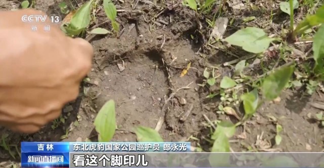 东北虎豹国家公园巡护员 郎永光:这个脚印应该是一只亚成年老虎。以前一年看到一次、两次都是很稀奇的,现在经常见。