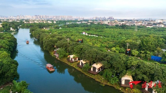 8月19日傍晚,莆田市荔城区西天尾镇北大村,游船驶过木兰溪流域。河流沿岸,荔枝林、农田、渡口,帐篷、休闲步道、露营地等,构成了一幅传统世外桃源般的“荔林水乡”图景。福建日报记者 施辰静 摄