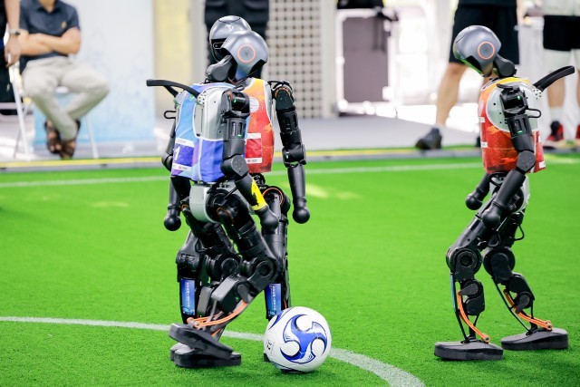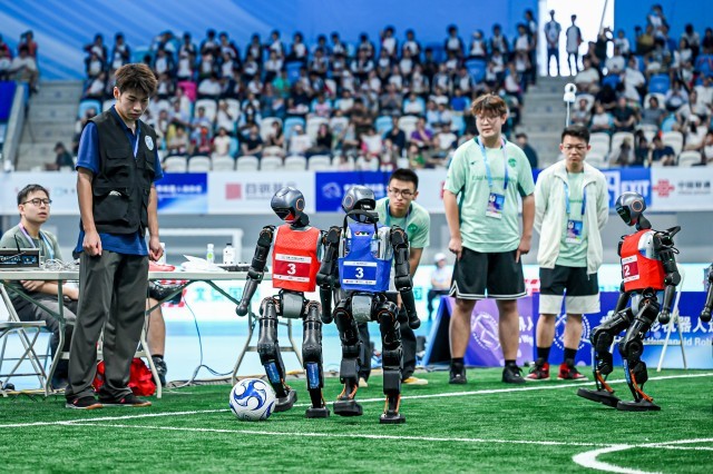 机器人踢足球,既是脑力活又是体力活。AI大脑“看”到场上情况,分析研判后,“决定”右腿膝关节和踝关节向特定方向旋转特定角度——这一套流程,着实考验参赛团队的科研实力。