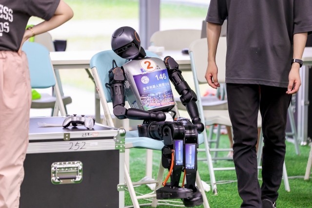 “2025世界人形机器人运动会”3V3足球赛比赛现场,机器人坐在椅子上休息。受访者供图