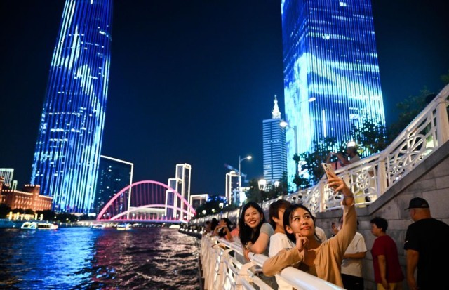 8月11日,游客在天津海河岸边拍照打卡。新华社记者 赵子硕 摄