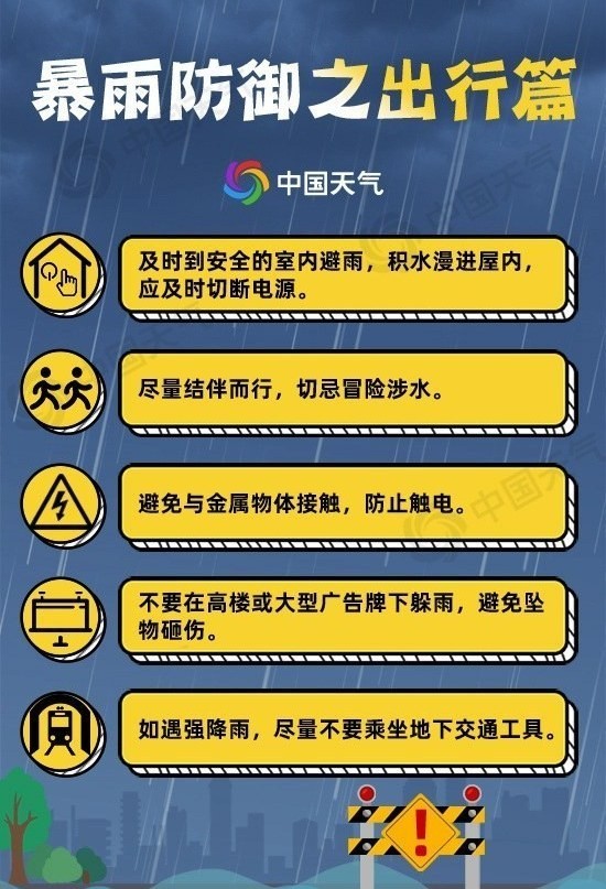 中国天气网再次提醒,当暴雨发生时,公众应该尽量避免出行,如确需出行,一定要提高安全意识,掌握一些行车避险技巧,保护自身的安全。