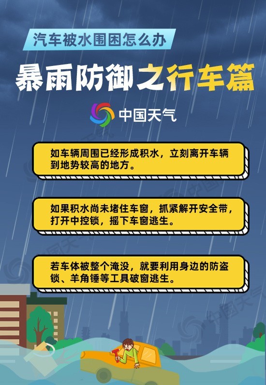 如车辆周围已经形成积水,最佳选择是立刻打开车门,离开车辆,步行至地势较高的地方。若积水已经较深,没过车体超过二分之一,这时车门有可能打不开,车窗就成了最佳的逃生路径。