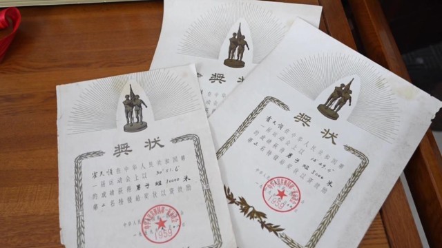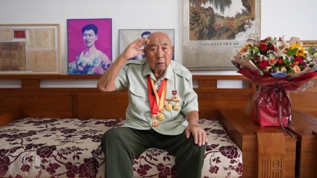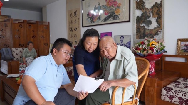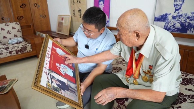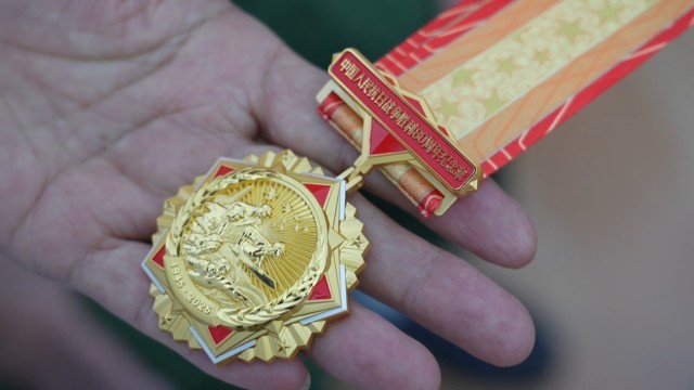 手捧“中国人民抗日战争胜利80周年”纪念章,