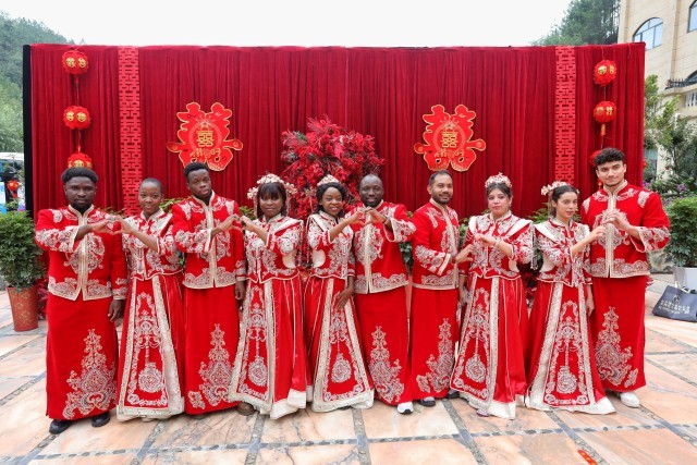 8月28日,湖北省郧西县,参加“海誓山盟·情定郧西”2025年青年集体婚礼暨传统婚俗体验活动的新人在合影留念。来自南非的皮丽丽(左二)和来自坦桑尼亚的马乐(左一)在中国相识相恋。中青报·中青网记者 李建泉/摄