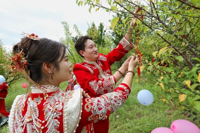 8月28日,湖北省郧西县,集体婚礼后,新人们共同参加“永结同心树 共育爱情林”活动。中青报·中青网记者 李建泉/摄