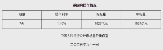 中新网9月1日电 据央行网站消息,2025年9月1日中国人民银行以固定利率、数量招标方式开展了1827亿元逆回购操作。具体情况如下: