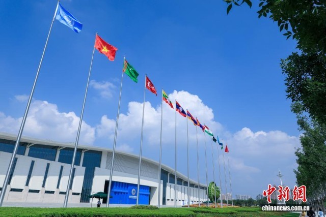 8月31日,天津,参加2025年上海合作组织峰会的各国旗帜在主会场外迎风飘扬。中新社记者 佟郁 摄