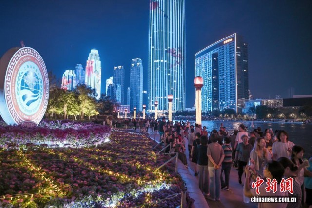 2025年上海合作组织峰会8月31日至9月1日在天津举行。资料图:8月28日晚,市民和游客漫步天津海河畔,参观“2025上海合作组织峰会”主题花坛。中新社记者 佟郁 摄