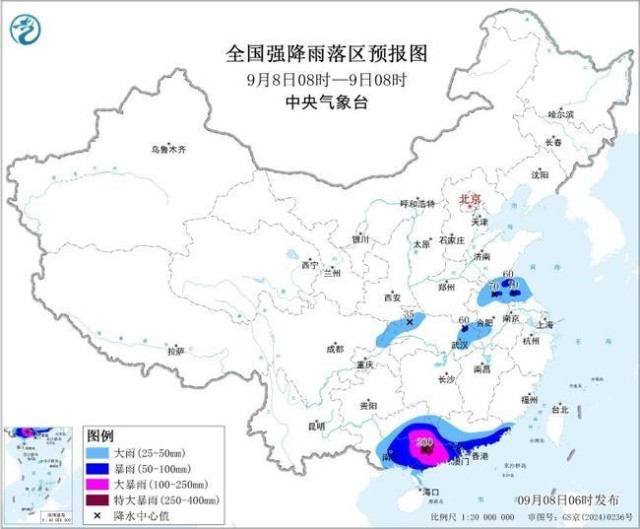 9月8日08时至9日08时,广东中南部、广西中东部有大到暴雨,其中,广西东部、广东西南部等地部分地区有大暴雨,局地有特大暴雨(250~280毫米)。