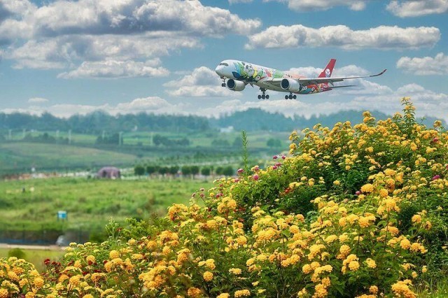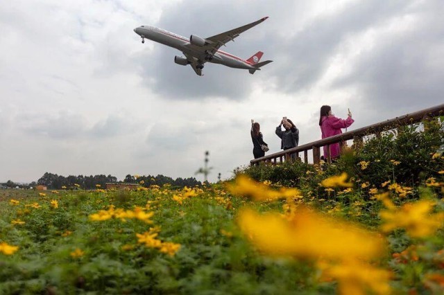 在这里,每2~3分钟便有一架飞机从头顶低空掠过,引擎的轰鸣声与花香交织带来特有的体验。人们站在花丛间抬头,便能清晰望见飞机从头顶滑向远方。