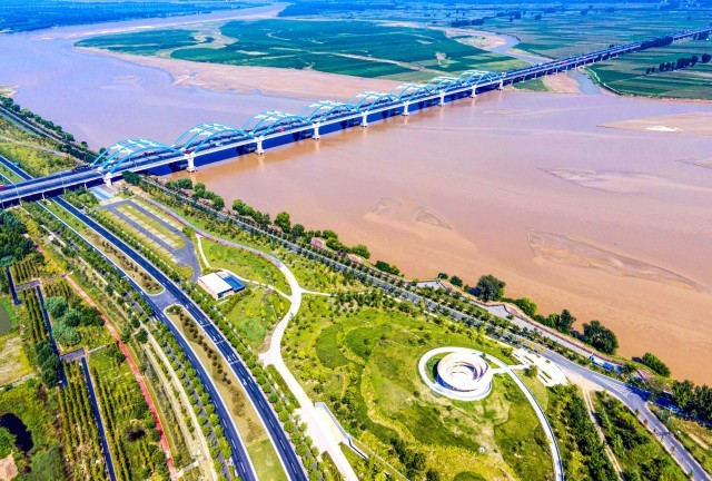 绿树成荫的郑州黄河大堤上,一边是奔腾向东的黄河,一边是平坦的公路。黄河生态廊道犹如一条绿色的飘带与蜿蜒的黄河相伴,美不胜收。