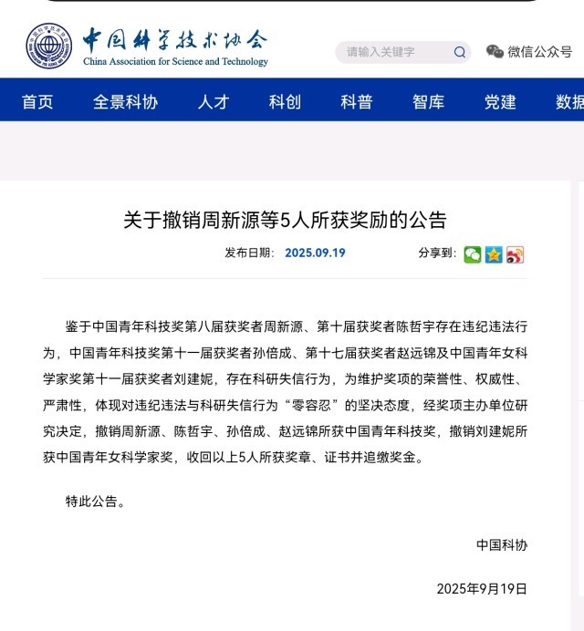 中国青年报客户端北京9月19日电(中青报·中青网记者 张渺)今天,中国科学技术协会在其官网发布《关于撤销周新源等5人所获奖励的公告》。公告提到,鉴于中国青年科技奖第八届获奖者周新源、第十届获奖者陈哲宇存在违纪违法行为,中国青年科技奖第十一届获奖者孙倍成、第十七届获奖者赵远锦及中国青年女科学家奖第十一届获奖者刘建妮,存在科研失信行为,为维护奖项的荣誉性、权威性、严肃性,体现对违纪违法与科研失信行为“零容忍”的坚决态度,经奖项主办单位研究决定,撤销周新源、陈哲宇、孙倍成、赵远锦所获中国青年科技奖,撤销刘建妮所获中国青年女科学家奖,收回以上5人所获奖章、证书并追缴奖金。