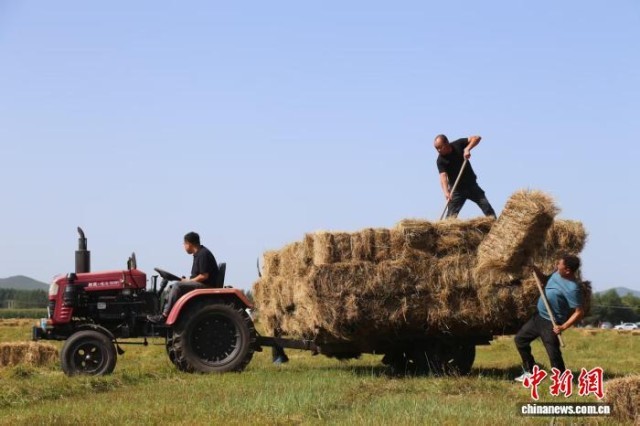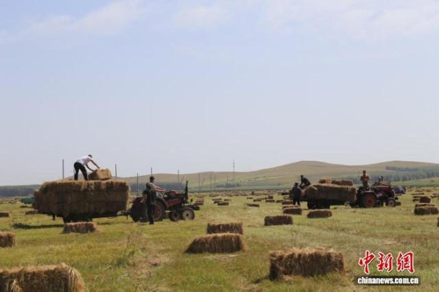 图为牧民们正在将收割的牧草装上车。 白玉亮 摄