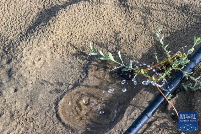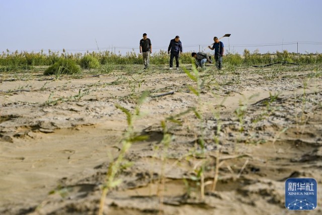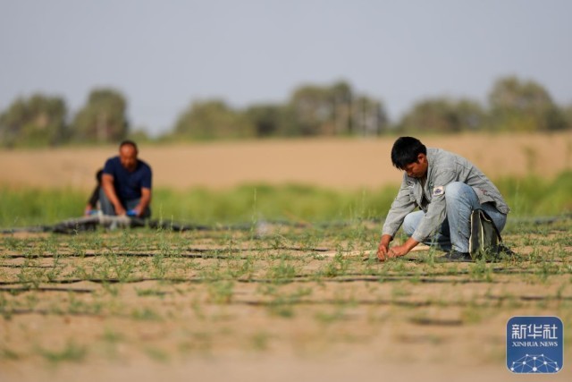 ↑ 9月20日,在新疆尉犁县境内的塔里木河南岸防沙治沙区,工作人员查看滴灌管情况。新华社记者 江文耀 摄