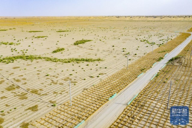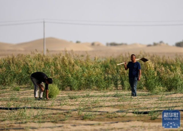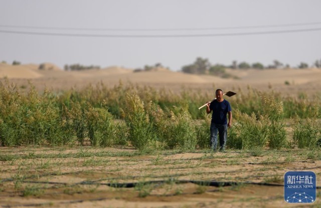 罗布麻具有耐旱、耐盐碱、耐寒暑、抗风沙、生态适应能力强等特点。当地规划罗布麻治沙技术区,采用种植罗布麻生物固沙和铺设草方格工程治沙的模式,减缓沙漠流动速度,阻隔沙漠对绿洲的侵袭。同时,当地建设罗布麻产业园,推动罗布麻在纺织、保健品等产业应用,带动当地1000余人就业增收。