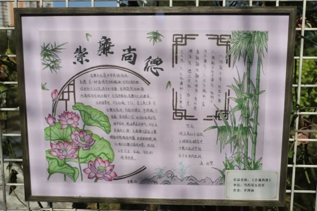 同时,为让家风与廉洁文化渗透至辖区的千家万户,让廉洁理念融入到人民对美好生活的向往中。地区居民踊跃参与,共征集书法、绘画、剪纸、手抄报、艺术画等廉洁文化作品共55幅,在“铃音鸣廉”走廊悬挂展示。