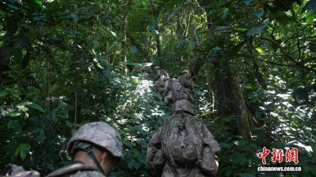 图为巡逻官兵穿越密林区。付丽豪 摄